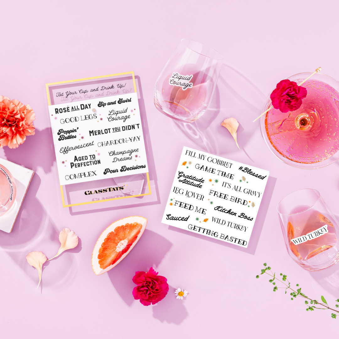 🍷 Thanksgiving GlassTats – A festive set made for turkey day laughs and drink order sanity.
