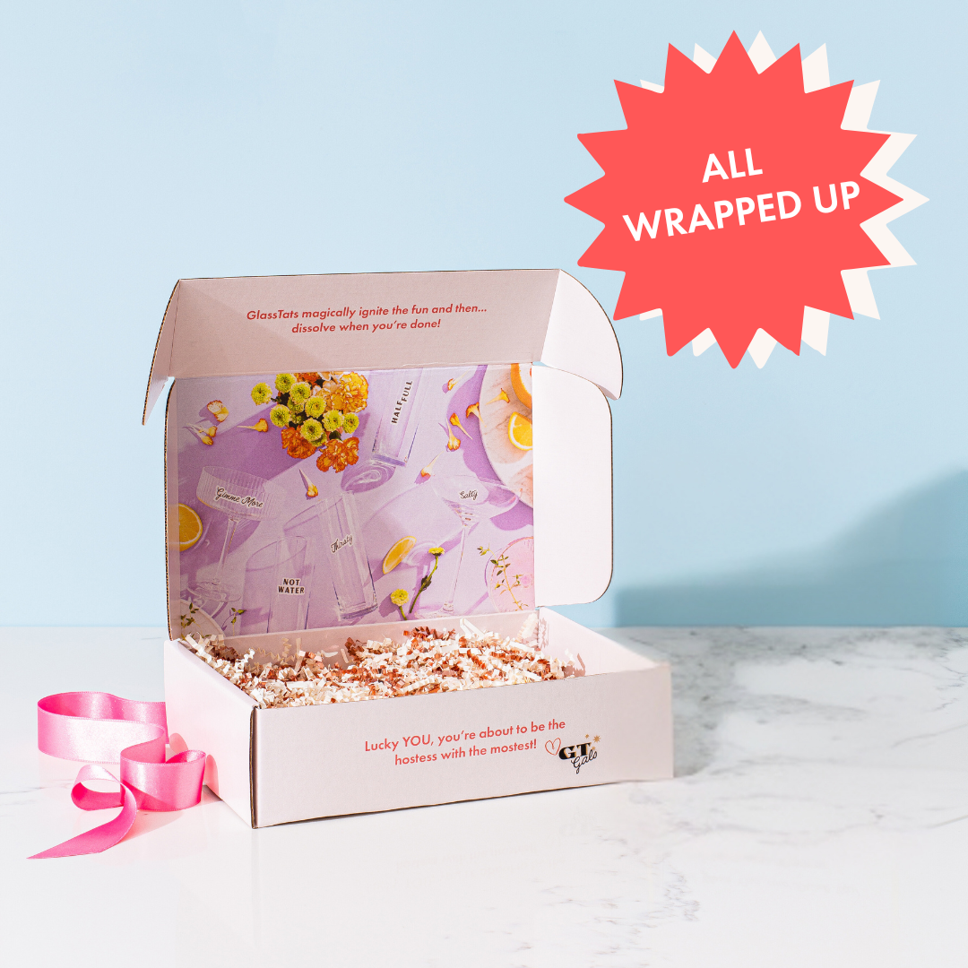 Our Thanksgiving Bar Box – a curated set featuring two witty GlassTats collections and a sleek acrylic display frame — everything your host needs to add fun and flair to the holiday bar or buffet.